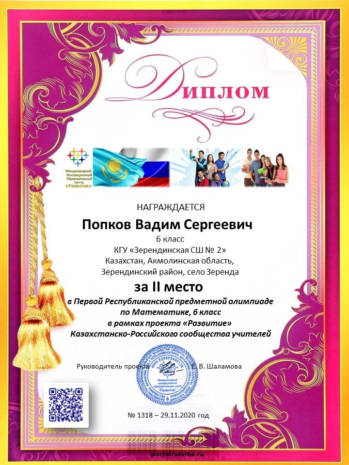 Поздравляем Ермуканова Асета и Попкова Вадима учеников 6 класса, занявших 3 и 2 место в Первой Республиканской олимпиаде по математике в рамках проекта "Развитие"